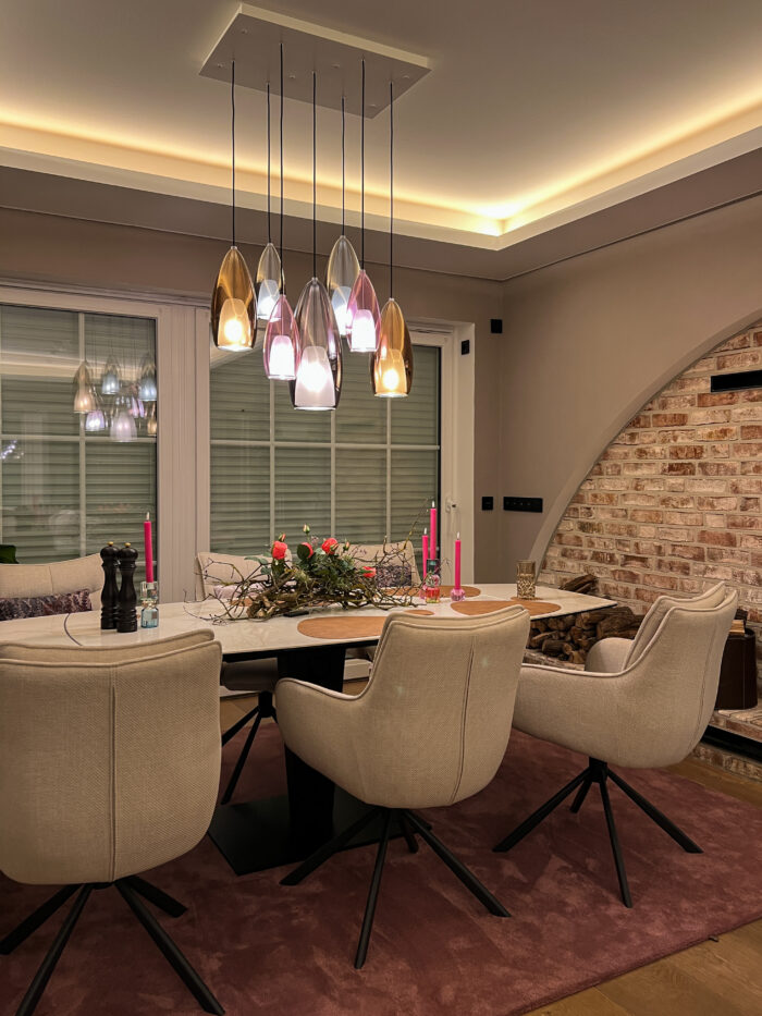 In diesem Projekt lag der Fokus auf der Neuinszenierung von Küche und Luftraum durch ein fein abgestimmtes Lichtkonzept. Moderne Pendelleuchten, dezente Deckenakzente und charaktervolle Glas-Pendelleuchten verleihen den Bereichen eine edle und stimmige Atmosphäre. Die Beleuchtung betont hochwertige Materialien, schafft visuelle Tiefe und verbindet Funktionalität mit ästhetischer Präzision. Im Luftraum setzt ein skulpturales Pendelensemble wirkungsvolle Highlights und unterstreicht die architektonische Großzügigkeit des Hauses. So entsteht ein harmonisches, hochwertiges Gesamtbild mit klarer, moderner Lichtsignatur.